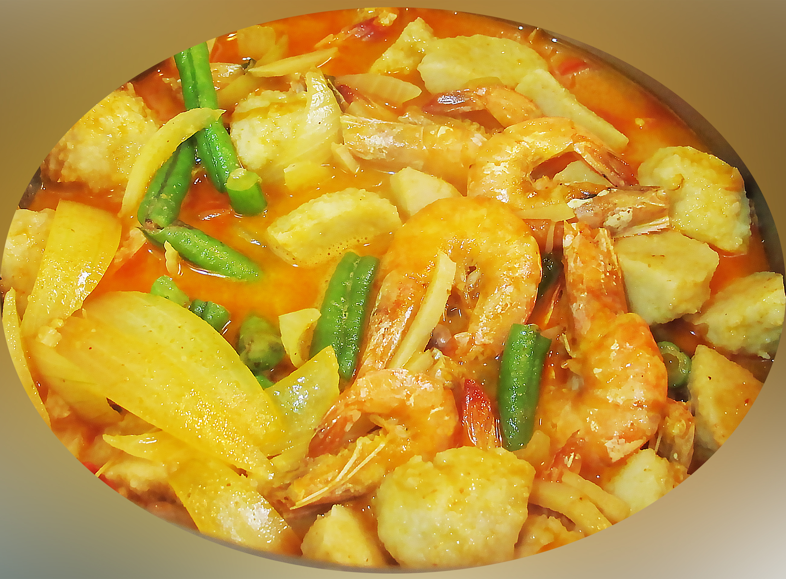 2.打開咖哩醬倒入鍋內,加入適量水將海鮮放入,步驟1的蔬菜加入,海鮮煮熟即可